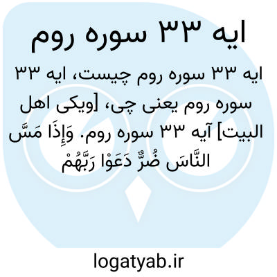 [ویکی اهل البیت] آیه 33 سوره روم. وَإِذَا مَسَّ النَّاسَ ضُرٌّ دَعَوْا رَبَّهُمْ مُنِیبِینَ إِلَیْهِ ثُمَّ إِذَا أَذَاقَهُمْ مِنْهُ رَحْمَةً إِذَا فَرِیقٌ مِنْهُمْ بِرَبِّهِمْ یُشْرِکُونَ