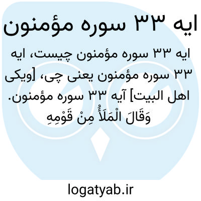 [ویکی اهل البیت] آیه 33 سوره مؤمنون. وَقَالَ الْمَلَأُ مِنْ قَوْمِهِ الَّذِینَ کَفَرُوا وَکَذَّبُوا بِلِقَاءِ الْآخِرَةِ وَأَتْرَفْنَاهُمْ فِی الْحَیَاةِ الدُّنْیَا مَا هَٰذَا إِلَّا بَشَرٌ مِثْلُکُمْ یَأْکُلُ مِمَّا تَأْکُلُونَ مِنْهُ وَیَشْرَبُ مِمَّا تَشْرَبُونَ