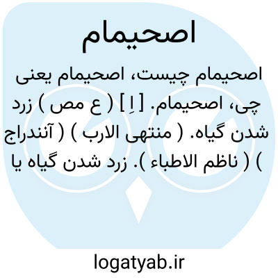 اصحیمام. [ اِ ] ( ع مص ) زرد شدن گیاه. ( منتهی الارب ) ( آنندراج ) ( ناظم الاطباء ). زرد شدن گیاه یا درآمیختن سیاهی سبزی آن به زردی. از اضداد است. ( از اقرب الموارد ) ( قطر المحیط ). || نیک سبز گردیدن گیاه.از لغات اضداد است، یا سیاهی سبزی آن زردی آمیخته شدن. ( منتهی الارب ). شدت یافتن سبزی گیاه. || اصحیمام زمین؛ تغییر یافتن گیاه آن. ( قطر المحیط ) ( از اقرب الموارد ). متغیرشدن گیاه زمین. ( منتهی الارب ). || پشت دادن یا رفتن باران زمین. ( از اقرب الموارد ). رفتن و پشت دادن باران زمین. ( منتهی الارب ). || اصحیمام زرع؛ سرما زدن کشت یارو به خشکی نهادن آن. ( از اقرب الموارد ) ( قطر المحیط ). سردی زده شدن زراعت و خشک شدن گرفتن. ( منتهی الارب ) ( آنندراج ). || زرد شدن. ( منتهی الارب ).