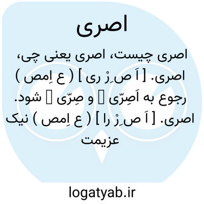 اصری. [ اَ ص ِرْ را ] ( ع اِمص ) نیک عزیمت بر کاری و جِدّو ثبات و دوام بر آن. ( منتهی الارب ) ( ناظم الاطباء ). صِرّی ̍. رجوع به صِرّی ̍ شود. یقال: انها منی صری؛ ای عزیمة و جد، و در آن لغات است: اَصِرّی ̍ و صِرّی و اَصِرّی و... و هی مشتقة من الاصرار ای الاقامة و الدوام علی الشی ٔ. ( از منتهی الارب ). و گاه گویند: کانت هذه الفعلة منی اَصِرّی، یعنی عزیمت. و اما صِرّی ̍ و اَصِرّی ̍، یای آنها به الف نقل شده است بنیت بیرون بردن آنها از فعل به اسم و اصل صری، اصری بود الف آن حذف شد و آن لغتی در صررت نیست. ( از اقرب الموارد ).