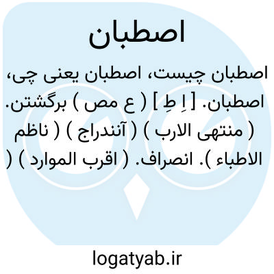 لغت نامه دهخدا اصطبان. [ اِ طِ ] ( ع مص ) برگشتن. ( منتهی الارب ) ( آنندراج ) ( ناظم الاطباء ). انصراف. ( اقرب الموارد ) ( قطر المحیط ). انصبان. ( اقرب الموارد ).