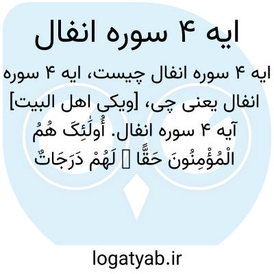 [ویکی اهل البیت] آیه 4 سوره انفال. أُولَٰئِکَ هُمُ الْمُؤْمِنُونَ حَقًّا ۚ لَهُمْ دَرَجَاتٌ عِنْدَ رَبِّهِمْ وَمَغْفِرَةٌ وَرِزْقٌ کَرِیمٌ