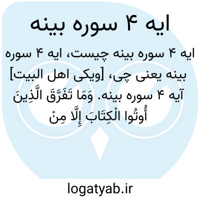 [ویکی اهل البیت] آیه 4 سوره بینه. وَمَا تَفَرَّقَ الَّذِینَ أُوتُوا الْکِتَابَ إِلَّا مِنْ بَعْدِ مَا جَاءَتْهُمُ الْبَیِّنَةُ