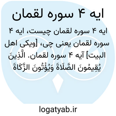 [ویکی اهل البیت] آیه 4 سوره لقمان. الَّذِینَ یُقِیمُونَ الصَّلَاةَ وَیُؤْتُونَ الزَّکَاةَ وَهُمْ بِالْآخِرَةِ هُمْ یُوقِنُونَ