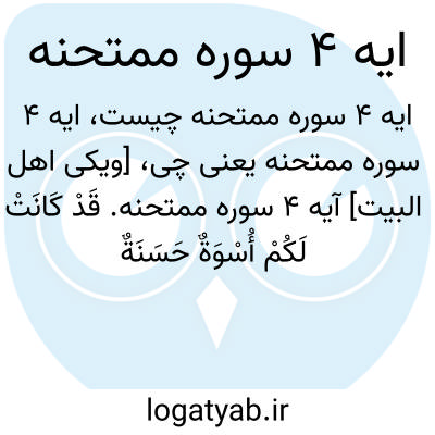 [ویکی اهل البیت] آیه 4 سوره ممتحنه. قَدْ کَانَتْ لَکُمْ أُسْوَةٌ حَسَنَةٌ فِی إِبْرَاهِیمَ وَالَّذِینَ مَعَهُ إِذْ قَالُوا لِقَوْمِهِمْ إِنَّا بُرَآءُ مِنْکُمْ وَمِمَّا تَعْبُدُونَ مِنْ دُونِ اللَّهِ کَفَرْنَا بِکُمْ وَبَدَا بَیْنَنَا وَبَیْنَکُمُ الْعَدَاوَةُ وَالْبَغْضَاءُ أَبَدًا حَتَّیٰ تُؤْمِنُوا بِاللَّهِ وَحْدَهُ إِلَّا قَوْلَ إِبْرَاهِیمَ لِأَبِیهِ لَأَسْتَغْفِرَنَّ لَکَ وَمَا أَمْلِکُ لَکَ مِنَ اللَّهِ مِنْ شَیْءٍ ۖ رَبَّنَا عَلَیْکَ تَوَکَّلْنَا وَإِلَیْکَ أَنَبْنَا وَإِلَیْکَ الْمَصِیرُ