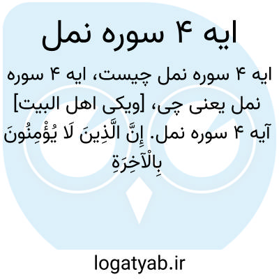 [ویکی اهل البیت] آیه 4 سوره نمل. إِنَّ الَّذِینَ لَا یُؤْمِنُونَ بِالْآخِرَةِ زَیَّنَّا لَهُمْ أَعْمَالَهُمْ فَهُمْ یَعْمَهُونَ