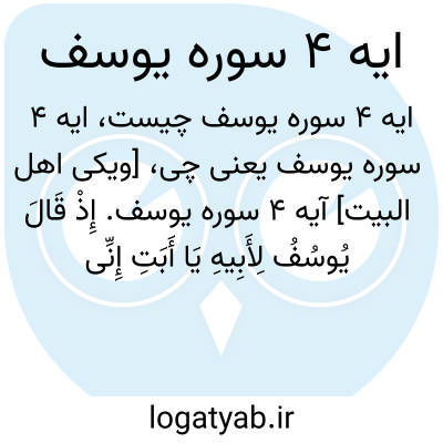 [ویکی اهل البیت] آیه 4 سوره یوسف. إِذْ قَالَ یُوسُفُ لِأَبِیهِ یَا أَبَتِ إِنِّی رَأَیْتُ أَحَدَ عَشَرَ کَوْکَبًا وَالشَّمْسَ وَالْقَمَرَ رَأَیْتُهُمْ لِی سَاجِدِینَ