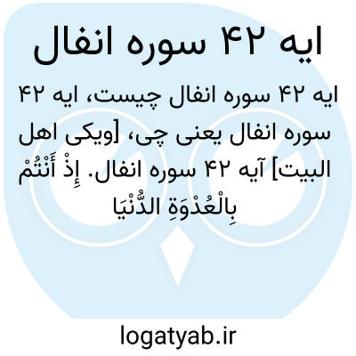 [ویکی اهل البیت] آیه 42 سوره انفال. إِذْ أَنْتُمْ بِالْعُدْوَةِ الدُّنْیَا وَهُمْ بِالْعُدْوَةِ الْقُصْوَیٰ وَالرَّکْبُ أَسْفَلَ مِنْکُمْ ۚ وَلَوْ تَوَاعَدْتُمْ لَاخْتَلَفْتُمْ فِی الْمِیعَادِ ۙ وَلَٰکِنْ لِیَقْضِیَ اللَّهُ أَمْرًا کَانَ مَفْعُولًا لِیَهْلِکَ مَنْ هَلَکَ عَنْ بَیِّنَةٍ وَیَحْیَیٰ مَنْ حَیَّ عَنْ بَیِّنَةٍ ۗ وَإِنَّ اللَّهَ لَسَمِیعٌ عَلِیمٌ