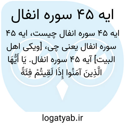 [ویکی اهل البیت] آیه 45 سوره انفال. یَا أَیُّهَا الَّذِینَ آمَنُوا إِذَا لَقِیتُمْ فِئَةً فَاثْبُتُوا وَاذْکُرُوا اللَّهَ کَثِیرًا لَعَلَّکُمْ تُفْلِحُونَ