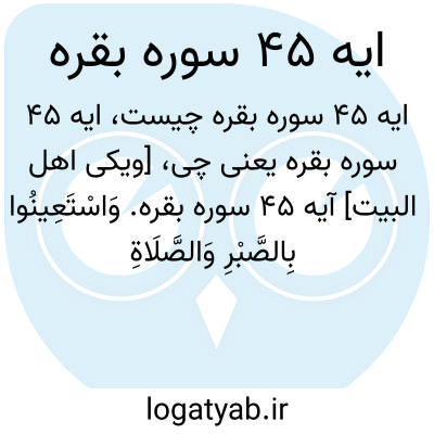 [ویکی اهل البیت] آیه 45 سوره بقره. وَاسْتَعِینُوا بِالصَّبْرِ وَالصَّلَاةِ ۚ وَإِنَّهَا لَکَبِیرَةٌ إِلَّا عَلَی الْخَاشِعِینَ