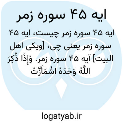 [ویکی اهل البیت] آیه 45 سوره زمر. وَإِذَا ذُکِرَ اللَّهُ وَحْدَهُ اشْمَأَزَّتْ قُلُوبُ الَّذِینَ لَا یُؤْمِنُونَ بِالْآخِرَةِ ۖ وَإِذَا ذُکِرَ الَّذِینَ مِنْ دُونِهِ إِذَا هُمْ یَسْتَبْشِرُونَ
