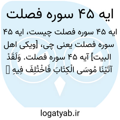 [ویکی اهل البیت] آیه 45 سوره فصلت. وَلَقَدْ آتَیْنَا مُوسَی الْکِتَابَ فَاخْتُلِفَ فِیهِ ۗ وَلَوْلَا کَلِمَةٌ سَبَقَتْ مِنْ رَبِّکَ لَقُضِیَ بَیْنَهُمْ ۚ وَإِنَّهُمْ لَفِی شَکٍّ مِنْهُ مُرِیبٍ