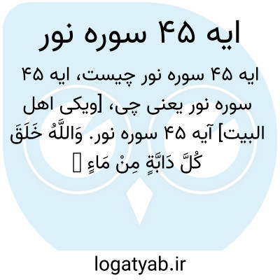 [ویکی اهل البیت] آیه 45 سوره نور. وَاللَّهُ خَلَقَ کُلَّ دَابَّةٍ مِنْ مَاءٍ ۖ فَمِنْهُمْ مَنْ یَمْشِی عَلَیٰ بَطْنِهِ وَمِنْهُمْ مَنْ یَمْشِی عَلَیٰ رِجْلَیْنِ وَمِنْهُمْ مَنْ یَمْشِی عَلَیٰ أَرْبَعٍ ۚ یَخْلُقُ اللَّهُ مَا یَشَاءُ ۚ إِنَّ اللَّهَ عَلَیٰ کُلِّ شَیْءٍ قَدِیرٌ