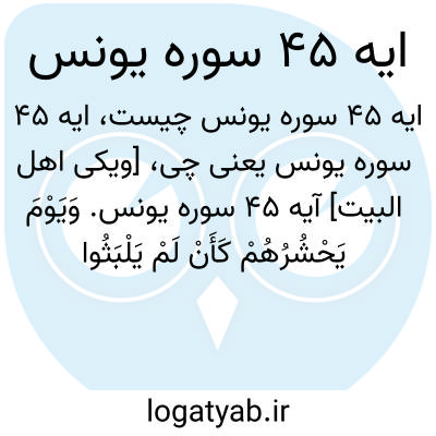 [ویکی اهل البیت] آیه 45 سوره یونس. وَیَوْمَ یَحْشُرُهُمْ کَأَنْ لَمْ یَلْبَثُوا إِلَّا سَاعَةً مِنَ النَّهَارِ یَتَعَارَفُونَ بَیْنَهُمْ ۚ قَدْ خَسِرَ الَّذِینَ کَذَّبُوا بِلِقَاءِ اللَّهِ وَمَا کَانُوا مُهْتَدِینَ