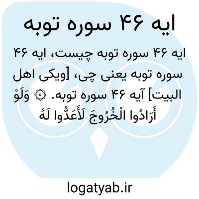 [ویکی اهل البیت] آیه 46 سوره توبه. ۞ وَلَوْ أَرَادُوا الْخُرُوجَ لَأَعَدُّوا لَهُ عُدَّةً وَلَٰکِنْ کَرِهَ اللَّهُ انْبِعَاثَهُمْ فَثَبَّطَهُمْ وَقِیلَ اقْعُدُوا مَعَ الْقَاعِدِینَ