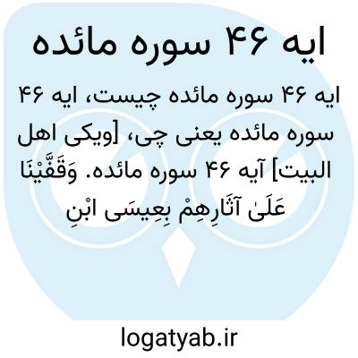 [ویکی اهل البیت] آیه 46 سوره مائده. وَقَفَّیْنَا عَلَیٰ آثَارِهِمْ بِعِیسَی ابْنِ مَرْیَمَ مُصَدِّقًا لِمَا بَیْنَ یَدَیْهِ مِنَ التَّوْرَاةِ ۖ وَآتَیْنَاهُ الْإِنْجِیلَ فِیهِ هُدًی وَنُورٌ وَمُصَدِّقًا لِمَا بَیْنَ یَدَیْهِ مِنَ التَّوْرَاةِ وَهُدًی وَمَوْعِظَةً لِلْمُتَّقِینَ