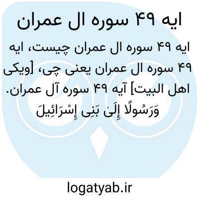 [ویکی اهل البیت] آیه 49 سوره آل عمران. وَرَسُولًا إِلَیٰ بَنِی إِسْرَائِیلَ أَنِّی قَدْ جِئْتُکُمْ بِآیَةٍ مِنْ رَبِّکُمْ ۖ أَنِّی أَخْلُقُ لَکُمْ مِنَ الطِّینِ کَهَیْئَةِ الطَّیْرِ فَأَنْفُخُ فِیهِ فَیَکُونُ طَیْرًا بِإِذْنِ اللَّهِ ۖ وَأُبْرِئُ الْأَکْمَهَ وَالْأَبْرَصَ وَأُحْیِی الْمَوْتَیٰ بِإِذْنِ اللَّهِ ۖ وَأُنَبِّئُکُمْ بِمَا تَأْکُلُونَ وَمَا تَدَّخِرُونَ فِی بُیُوتِکُمْ ۚ إِنَّ فِی ذَٰلِکَ لَآیَةً لَکُمْ إِنْ کُنْتُمْ مُؤْمِنِینَ