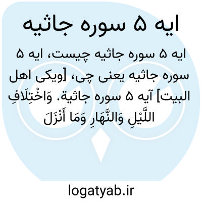 [ویکی اهل البیت] آیه 5 سوره جاثیه. وَاخْتِلَافِ اللَّیْلِ وَالنَّهَارِ وَمَا أَنْزَلَ اللَّهُ مِنَ السَّمَاءِ مِنْ رِزْقٍ فَأَحْیَا بِهِ الْأَرْضَ بَعْدَ مَوْتِهَا وَتَصْرِیفِ الرِّیَاحِ آیَاتٌ لِقَوْمٍ یَعْقِلُونَ