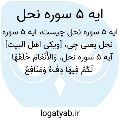 [ویکی اهل البیت] آیه 5 سوره نحل. وَالْأَنْعَامَ خَلَقَهَا ۗ لَکُمْ فِیهَا دِفْءٌ وَمَنَافِعُ وَمِنْهَا تَأْکُلُونَ