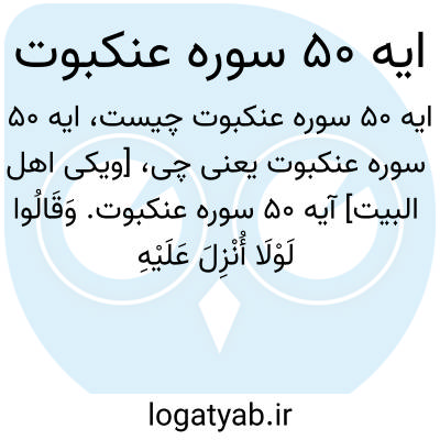[ویکی اهل البیت] آیه 50 سوره عنکبوت. وَقَالُوا لَوْلَا أُنْزِلَ عَلَیْهِ آیَاتٌ مِنْ رَبِّهِ ۖ قُلْ إِنَّمَا الْآیَاتُ عِنْدَ اللَّهِ وَإِنَّمَا أَنَا نَذِیرٌ مُبِینٌ
