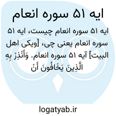 [ویکی اهل البیت] آیه 51 سوره انعام. وَأَنْذِرْ بِهِ الَّذِینَ یَخَافُونَ أَنْ یُحْشَرُوا إِلَیٰ رَبِّهِمْ ۙ لَیْسَ لَهُمْ مِنْ دُونِهِ وَلِیٌّ وَلَا شَفِیعٌ لَعَلَّهُمْ یَتَّقُونَ