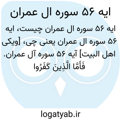 [ویکی اهل البیت] آیه 56 سوره آل عمران. فَأَمَّا الَّذِینَ کَفَرُوا فَأُعَذِّبُهُمْ عَذَابًا شَدِیدًا فِی الدُّنْیَا وَالْآخِرَةِ وَمَا لَهُمْ مِنْ نَاصِرِینَ