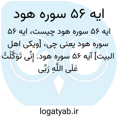 [ویکی اهل البیت] آیه 56 سوره هود. إِنِّی تَوَکَّلْتُ عَلَی اللَّهِ رَبِّی وَرَبِّکُمْ ۚ مَا مِنْ دَابَّةٍ إِلَّا هُوَ آخِذٌ بِنَاصِیَتِهَا ۚ إِنَّ رَبِّی عَلَیٰ صِرَاطٍ مُسْتَقِیمٍ