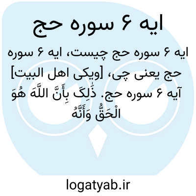 [ویکی اهل البیت] آیه 6 سوره حج. ذَٰلِکَ بِأَنَّ اللَّهَ هُوَ الْحَقُّ وَأَنَّهُ یُحْیِی الْمَوْتَیٰ وَأَنَّهُ عَلَیٰ کُلِّ شَیْءٍ قَدِیرٌ