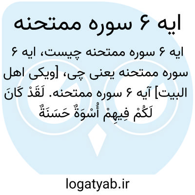 [ویکی اهل البیت] آیه 6 سوره ممتحنه. لَقَدْ کَانَ لَکُمْ فِیهِمْ أُسْوَةٌ حَسَنَةٌ لِمَنْ کَانَ یَرْجُو اللَّهَ وَالْیَوْمَ الْآخِرَ ۚ وَمَنْ یَتَوَلَّ فَإِنَّ اللَّهَ هُوَ الْغَنِیُّ الْحَمِیدُ