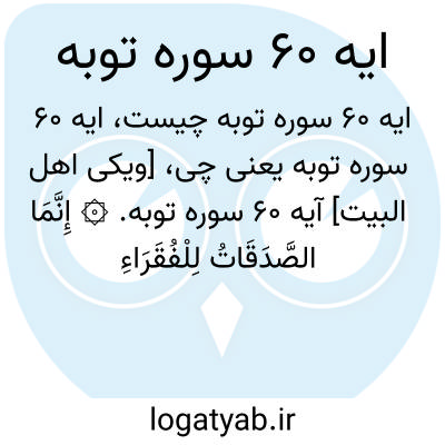 [ویکی اهل البیت] آیه 60 سوره توبه. ۞ إِنَّمَا الصَّدَقَاتُ لِلْفُقَرَاءِ وَالْمَسَاکِینِ وَالْعَامِلِینَ عَلَیْهَا وَالْمُؤَلَّفَةِ قُلُوبُهُمْ وَفِی الرِّقَابِ وَالْغَارِمِینَ وَفِی سَبِیلِ اللَّهِ وَابْنِ السَّبِیلِ ۖ فَرِیضَةً مِنَ اللَّهِ ۗ وَاللَّهُ عَلِیمٌ حَکِیمٌ