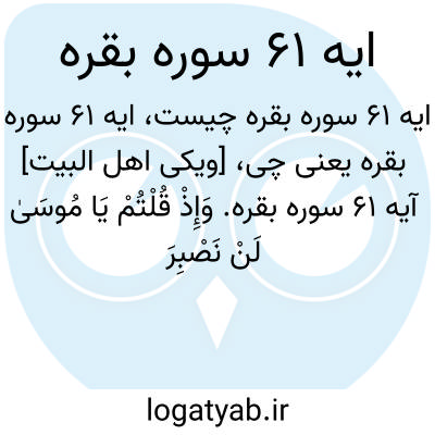 [ویکی اهل البیت] آیه 61 سوره بقره. وَإِذْ قُلْتُمْ یَا مُوسَیٰ لَنْ نَصْبِرَ عَلَیٰ طَعَامٍ وَاحِدٍ فَادْعُ لَنَا رَبَّکَ یُخْرِجْ لَنَا مِمَّا تُنْبِتُ الْأَرْضُ مِنْ بَقْلِهَا وَقِثَّائِهَا وَفُومِهَا وَعَدَسِهَا وَبَصَلِهَا ۖ قَالَ أَتَسْتَبْدِلُونَ الَّذِی هُوَ أَدْنَیٰ بِالَّذِی هُوَ خَیْرٌ ۚ اهْبِطُوا مِصْرًا فَإِنَّ لَکُمْ مَا سَأَلْتُمْ ۗ وَضُرِبَتْ عَلَیْهِمُ الذِّلَّةُ وَالْمَسْکَنَةُ وَبَاءُوا بِغَضَبٍ مِنَ اللَّهِ ۗ ذَٰلِکَ بِأَنَّهُمْ کَانُوا یَکْفُرُونَ بِآیَاتِ اللَّهِ وَیَقْتُلُونَ النَّبِیِّینَ بِغَیْرِ الْحَقِّ ۗ ذَٰلِکَ بِمَا عَصَوْا وَکَانُوا یَعْتَدُونَ