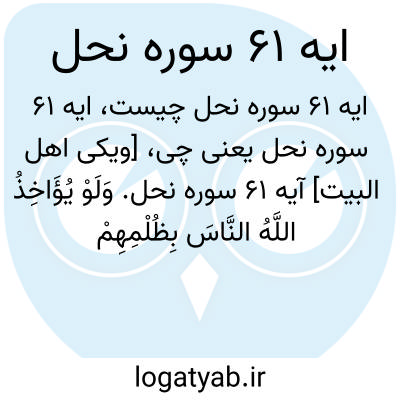 [ویکی اهل البیت] آیه 61 سوره نحل. وَلَوْ یُؤَاخِذُ اللَّهُ النَّاسَ بِظُلْمِهِمْ مَا تَرَکَ عَلَیْهَا مِنْ دَابَّةٍ وَلَٰکِنْ یُؤَخِّرُهُمْ إِلَیٰ أَجَلٍ مُسَمًّی ۖ فَإِذَا جَاءَ أَجَلُهُمْ لَا یَسْتَأْخِرُونَ سَاعَةً ۖ وَلَا یَسْتَقْدِمُونَ