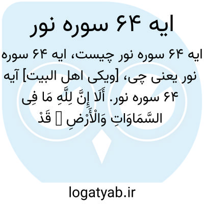 [ویکی اهل البیت] آیه 64 سوره نور. أَلَا إِنَّ لِلَّهِ مَا فِی السَّمَاوَاتِ وَالْأَرْضِ ۖ قَدْ یَعْلَمُ مَا أَنْتُمْ عَلَیْهِ وَیَوْمَ یُرْجَعُونَ إِلَیْهِ فَیُنَبِّئُهُمْ بِمَا عَمِلُوا ۗ وَاللَّهُ بِکُلِّ شَیْءٍ عَلِیمٌ