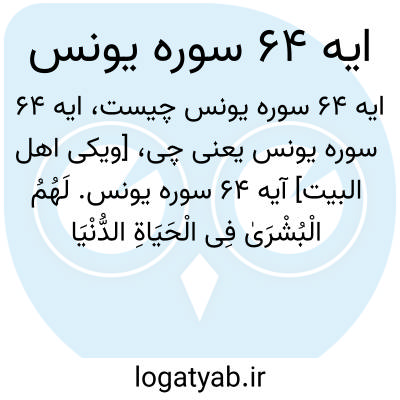 [ویکی اهل البیت] آیه 64 سوره یونس. لَهُمُ الْبُشْرَیٰ فِی الْحَیَاةِ الدُّنْیَا وَفِی الْآخِرَةِ ۚ لَا تَبْدِیلَ لِکَلِمَاتِ اللَّهِ ۚ ذَٰلِکَ هُوَ الْفَوْزُ الْعَظِیمُ