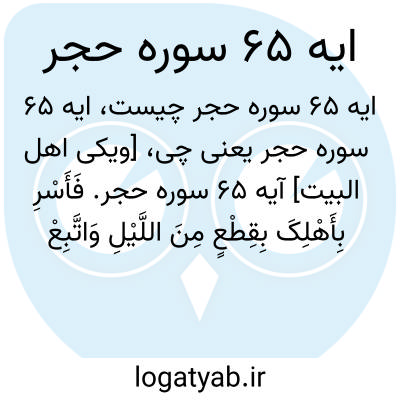[ویکی اهل البیت] آیه 65 سوره حجر. فَأَسْرِ بِأَهْلِکَ بِقِطْعٍ مِنَ اللَّیْلِ وَاتَّبِعْ أَدْبَارَهُمْ وَلَا یَلْتَفِتْ مِنْکُمْ أَحَدٌ وَامْضُوا حَیْثُ تُؤْمَرُونَ