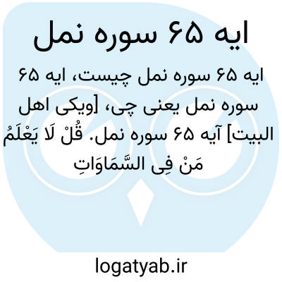 [ویکی اهل البیت] آیه 65 سوره نمل. قُلْ لَا یَعْلَمُ مَنْ فِی السَّمَاوَاتِ وَالْأَرْضِ الْغَیْبَ إِلَّا اللَّهُ ۚ وَمَا یَشْعُرُونَ أَیَّانَ یُبْعَثُونَ