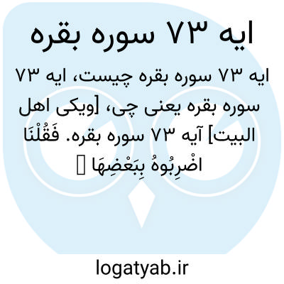 [ویکی اهل البیت] آیه 73 سوره بقره. فَقُلْنَا اضْرِبُوهُ بِبَعْضِهَا ۚ کَذَٰلِکَ یُحْیِی اللَّهُ الْمَوْتَیٰ وَیُرِیکُمْ آیَاتِهِ لَعَلَّکُمْ تَعْقِلُونَ