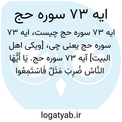 [ویکی اهل البیت] آیه 73 سوره حج. یَا أَیُّهَا النَّاسُ ضُرِبَ مَثَلٌ فَاسْتَمِعُوا لَهُ ۚ إِنَّ الَّذِینَ تَدْعُونَ مِنْ دُونِ اللَّهِ لَنْ یَخْلُقُوا ذُبَابًا وَلَوِ اجْتَمَعُوا لَهُ ۖ وَإِنْ یَسْلُبْهُمُ الذُّبَابُ شَیْئًا لَا یَسْتَنْقِذُوهُ مِنْهُ ۚ ضَعُفَ الطَّالِبُ وَالْمَطْلُوبُ