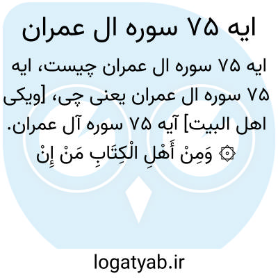 [ویکی اهل البیت] آیه 75 سوره آل عمران. ۞ وَمِنْ أَهْلِ الْکِتَابِ مَنْ إِنْ تَأْمَنْهُ بِقِنْطَارٍ یُؤَدِّهِ إِلَیْکَ وَمِنْهُمْ مَنْ إِنْ تَأْمَنْهُ بِدِینَارٍ لَا یُؤَدِّهِ إِلَیْکَ إِلَّا مَا دُمْتَ عَلَیْهِ قَائِمًا ۗ ذَٰلِکَ بِأَنَّهُمْ قَالُوا لَیْسَ عَلَیْنَا فِی الْأُمِّیِّینَ سَبِیلٌ وَیَقُولُونَ عَلَی اللَّهِ الْکَذِبَ وَهُمْ یَعْلَمُونَ