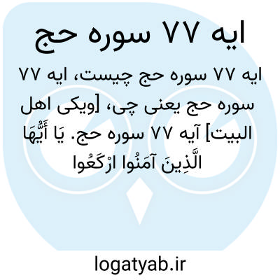 [ویکی اهل البیت] آیه 77 سوره حج. یَا أَیُّهَا الَّذِینَ آمَنُوا ارْکَعُوا وَاسْجُدُوا وَاعْبُدُوا رَبَّکُمْ وَافْعَلُوا الْخَیْرَ لَعَلَّکُمْ تُفْلِحُونَ ۩