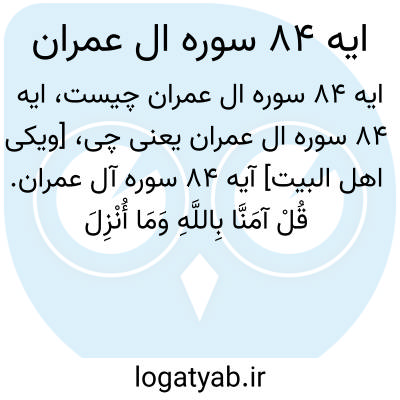 [ویکی اهل البیت] آیه 84 سوره آل عمران. قُلْ آمَنَّا بِاللَّهِ وَمَا أُنْزِلَ عَلَیْنَا وَمَا أُنْزِلَ عَلَیٰ إِبْرَاهِیمَ وَإِسْمَاعِیلَ وَإِسْحَاقَ وَیَعْقُوبَ وَالْأَسْبَاطِ وَمَا أُوتِیَ مُوسَیٰ وَعِیسَیٰ وَالنَّبِیُّونَ مِنْ رَبِّهِمْ لَا نُفَرِّقُ بَیْنَ أَحَدٍ مِنْهُمْ وَنَحْنُ لَهُ مُسْلِمُونَ
