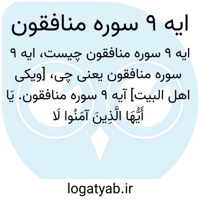 [ویکی اهل البیت] آیه 9 سوره منافقون. یَا أَیُّهَا الَّذِینَ آمَنُوا لَا تُلْهِکُمْ أَمْوَالُکُمْ وَلَا أَوْلَادُکُمْ عَنْ ذِکْرِ اللَّهِ ۚ وَمَنْ یَفْعَلْ ذَٰلِکَ فَأُولَٰئِکَ هُمُ الْخَاسِرُونَ