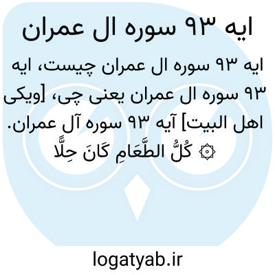 [ویکی اهل البیت] آیه 93 سوره آل عمران. ۞ کُلُّ الطَّعَامِ کَانَ حِلًّا لِبَنِی إِسْرَائِیلَ إِلَّا مَا حَرَّمَ إِسْرَائِیلُ عَلَیٰ نَفْسِهِ مِنْ قَبْلِ أَنْ تُنَزَّلَ التَّوْرَاةُ ۗ قُلْ فَأْتُوا بِالتَّوْرَاةِ فَاتْلُوهَا إِنْ کُنْتُمْ صَادِقِینَ