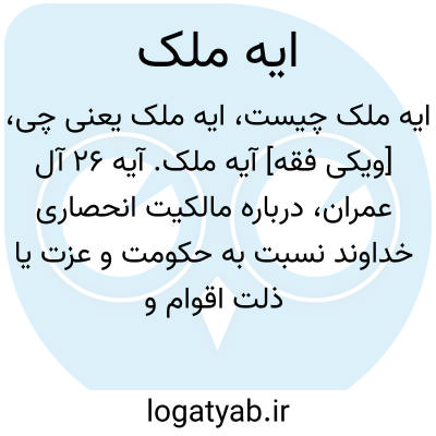 [ویکی شیعه] آیه ملک. آیه مُلک آیه ۲۶ سوره آل عمران است که مالکیت و فرمانروایی هستی را برای خدا دانسته است. این آیه را در پاسخ به ادعای اهل کتاب دانسته اند که خود را از خاصان خدا می پنداشتند. این آیه بخشیدن یا ستاندن حکومت و فرمانروایی و همچنین بخشیدن عزت و ذلت را به دست خداوند می داند. به باور برخی از مفسران بخشیدن حکومت به ظالمان نیز توسط خدا انجام می شود؛ ولی به این معنا نیست که حکومت آنان مورد تأیید و رضایت خداوند است.