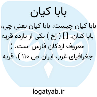 لغت نامه دهخدا بابا کیان. [ ] ( اِخ ) یکی از یازده قریه معروف اردکان فارس است. ( جغرافیای غرب ایران ص 110 ). قریه ای است به سه فرسنگی میانه جنوب و مشرق اردکان. ( فارسنامه ناصری ).