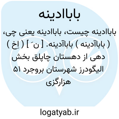 ( باباآدینه ) باباآدینه. [ ن َ ] ( اِخ ) دهی از دهستان چاپلق بخش الیگودرز شهرستان بروجرد 51 هزارگزی شمال باختری الیگودرز کنار راه مالرو کیله به ده آقاجلگه، معتدل. سکنه آن 19 تن شیعه، لری، بختیاری. آب آن از قنات و چاه و محصول آنجا غلات،تریاک، لبنیات و شغل اهالی زراعت و گله داری صنایع دستی زنان قالی و جاجیم بافی است. راه مالرو دارد. اتومبیل هم میتوان برد. ( فرهنگ جغرافیائی ایران ج 6 ).