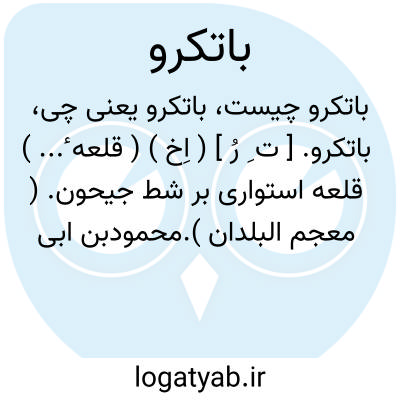 باتکرو. [ ت ِ رُ ] ( اِخ ) ( قلعه ٔ... ) قلعه استواری بر شط جیحون. ( معجم البلدان ).محمودبن ابی توبه بدانجا زندان شد. ( لباب الالباب عوفی چ لیدن ج 1 ص 75 ). و رجوع به ص 77 همان کتاب شود.