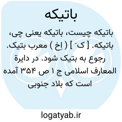باتیکه. [ ک َ ] ( اِخ ) معرب بتیک. رجوع به بتیک شود. در دایرة المعارف اسلامی ج 1 ص 354 آمده است که بلاد جنوبی اسپانیارا باتیکه می نامیدند. ( الحلل السندسیه ج 1 ص 32 ).