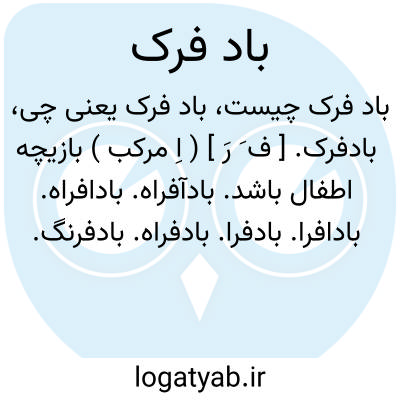 بادفرک. [ ف َ رَ ] ( اِ مرکب ) بازیچه اطفال باشد. بادآفراه. بادافراه. بادافرا. بادفرا. بادفراه. بادفرنگ. بادفرنک. بادفر. بادفره. بادبر. بادبره. بادبرک. ( محمودبن عمر ربنجنی ). بادپر. فرفر. فرموک. فرفروک. فرفره.بهنه. پهنه. گردنای. شیربانگ. گِلگیس. پِل. خراره. دوّامه. خذروف. رجوع به هر یک از کلمات مذکور شود.