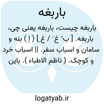 باربغه. [ ب ُ غ َ / غ ِ] ( اِ ) بنه و سامان و اسباب سفر. || اسباب خرد و کوچک. ( ناظم الاطباء ). باین معانی مصحف «باربنه » است. || باملایمت و آهستگی. ( ناظم الاطباء ). مأخذ معلوم نیست و شاهدی هم در دست نمیباشد.